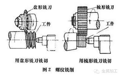 在螺纹铣床上用盘形铣刀或梳形铣刀进行铣削。盘形铣刀主要用于铣削丝杆、蜗杆等工件上的梯形外螺纹。梳形铣刀用于铣削内、外普通螺纹和锥螺纹,由于是用多刃铣刀铣削、其工作部分的长度又大于被加工螺纹的长度,故工件只需要旋转1.25~1.5转就可加工完成,生产率很高。螺纹铣削的螺距精度一般能达 8~9级,表面粗糙度为R5~0.63微米。这种方法适用于成批生产一般精度的螺纹工件或磨削前的粗加工。